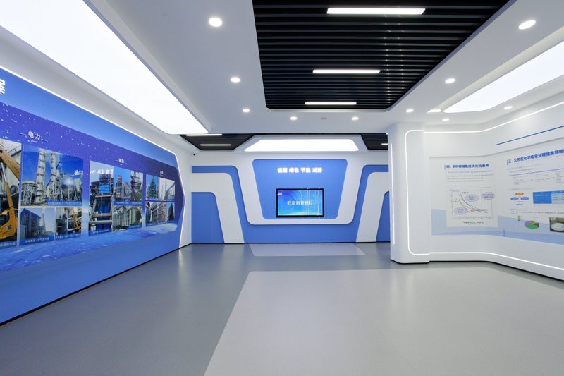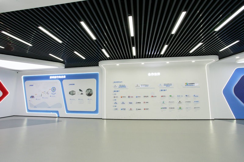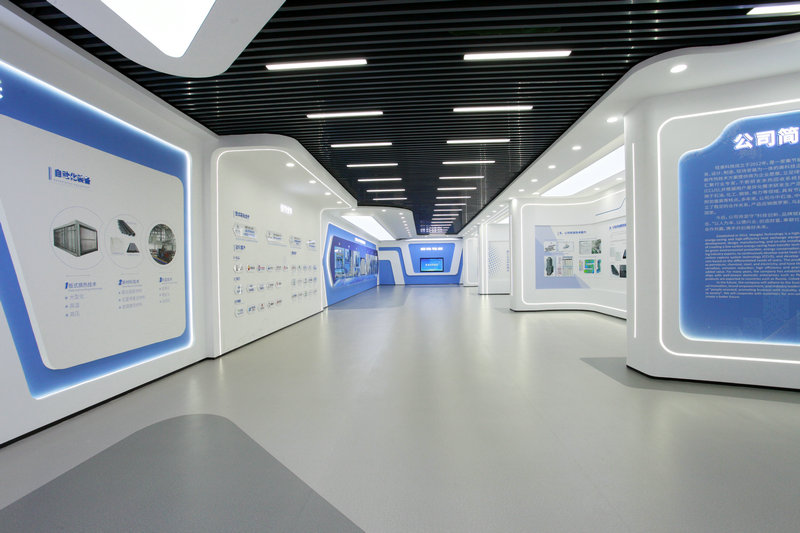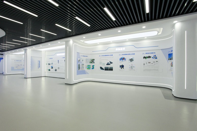頂和地面造型統(tǒng)一,白色吊頂和灰色橡膠地面,黑色方鋼吊頂和灰色橡膠地面相互呼應(yīng),統(tǒng)一中富有變化,變化中又蘊(yùn)含統(tǒng)一,使整個(gè)展廳科技意境深遠(yuǎn)悠長。